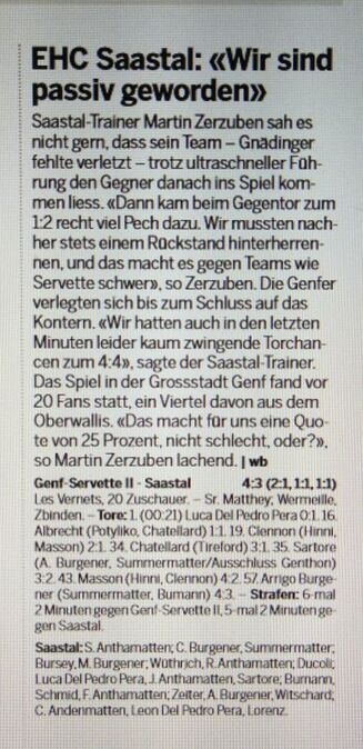 HC Vallée de Joux - EHC Saastal 0:6 (0:2, 0:2, 0:2)