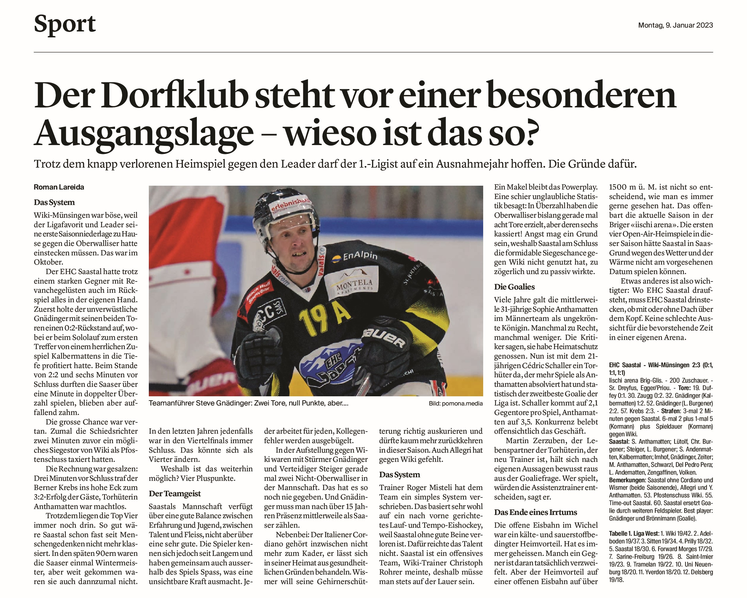 Der EHC Saastal gewann in Morges mit 3:0, Yannis Anthamatten (32.), Christoph Burgener (43.) und Simon Andenmatten (50.) schossen die Tore, als Goalie agierte Sophie Anthamatten.
