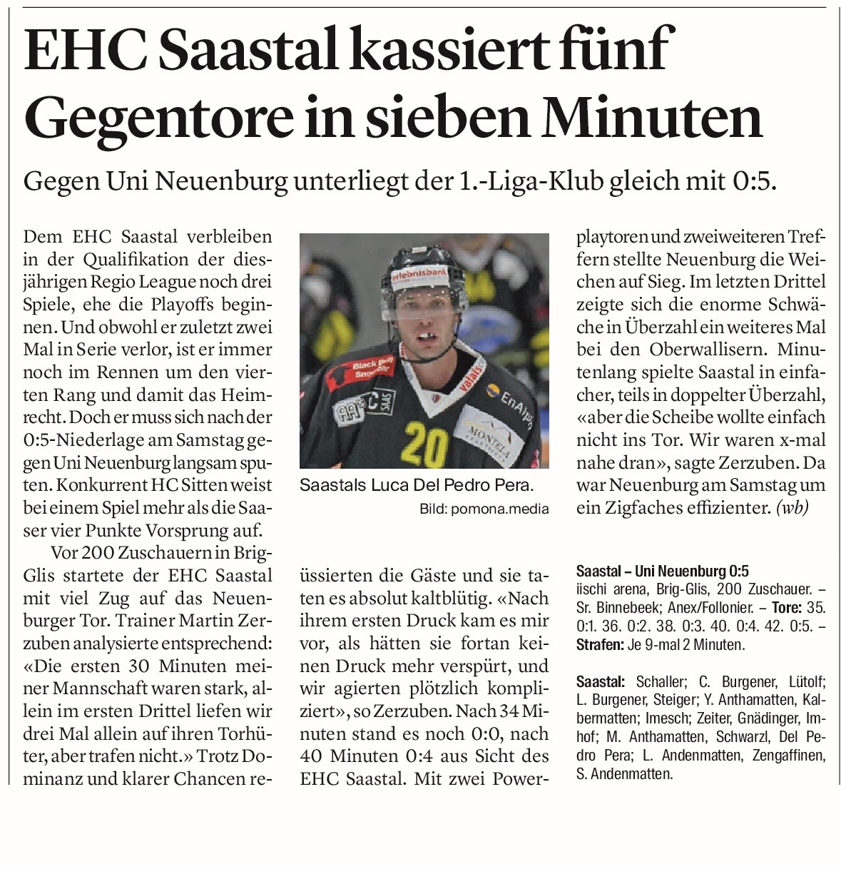 EHC Saastal vs. HC Neuchâtel Uni 0:5 (0:0/0:4/0:1)