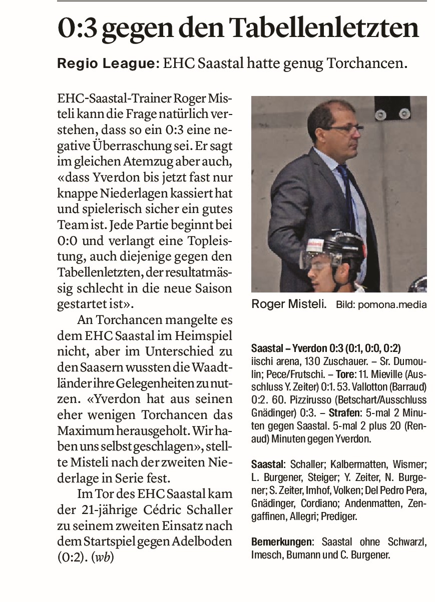EHC Saastal vs. HC Yverdon les Bains 0:3 (0:1/0:0/0:2)