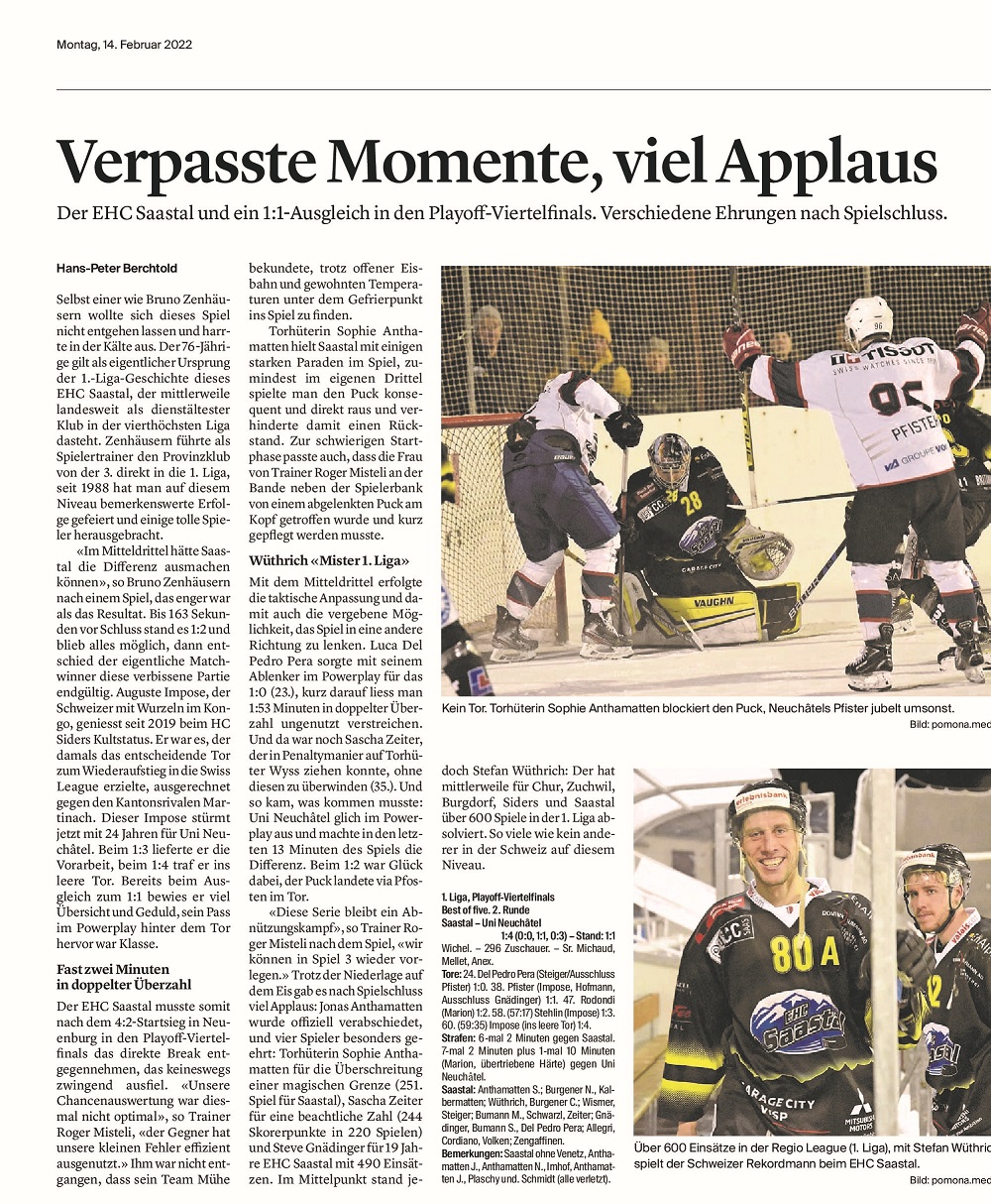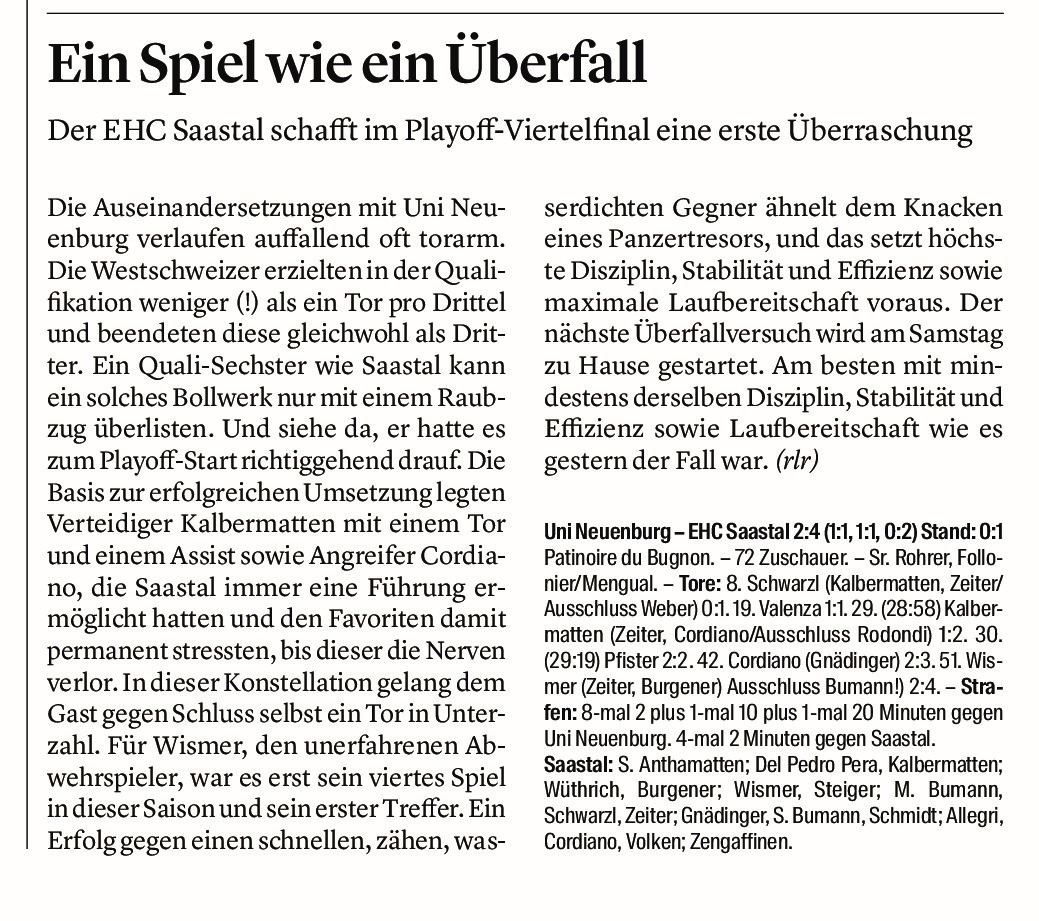 Saastal bezwingt Neuenburg mit 4:2 auswärts. Nun führen die Saaser in der Serie mit 1:0.