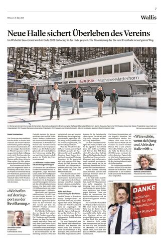 Das Projekt «Eine Eishalle für das Saastal» ist bereits weit fortgeschritten. Das Bauvorhaben liegt dem Staat vor und die Gemeinderäte des Tales sind positiv gestimmt. Sobald die AG die Kantonale Baubewilliung erhält, beginnt der Startschuss. Die AG sieht den Erhalt der Bewilligung zuversichtlich. Alle Vormeinungen fielen positiv aus. Darum wird mit dem Erhalt der Baubewilligung zwischen Mai & Juni 2021 gerechnet. Gemäss Zeitplan ist der Baustart im Sommer 2021 und endet im Dezember 2022. Während diesem Jahr ist man mit Visp und Brig schon nach Lösungen am Suchen.