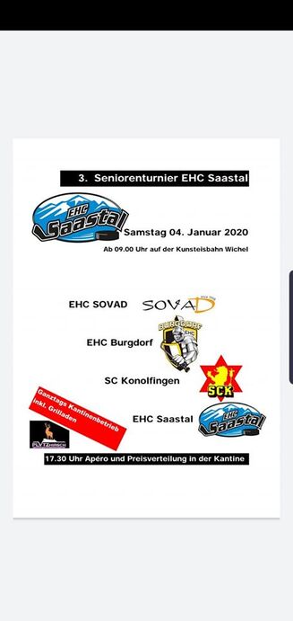 Das 3. Seniorenturnier vom EHC Saastal wird am Samstag, 4. Januar 2020 in Saas-Grund "Wichel" ausgetragen.