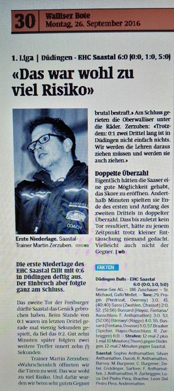 Es gelang nicht viel, trotz enormen Bemühungen und somit hiess es schlussendlich 0:6 für die Gastgeber. Gegen ein solides Düdingen konnten unsere Stärken nicht ausgespielt werden, trotzdem hielten die Saaser bis zur 40 Min. entgegen und waren bereit für die Punkte zu kämpfen. Jedoch im Schlussdrittel erzielten die Düdingen Bulls nach 40 Sek. das 0:2, welches das Spiel vorerst entschied. Kurz daraufhin fielen die Saaser auseinander und bei den Düdingen Bulls harmonierte plötlzlich alles.